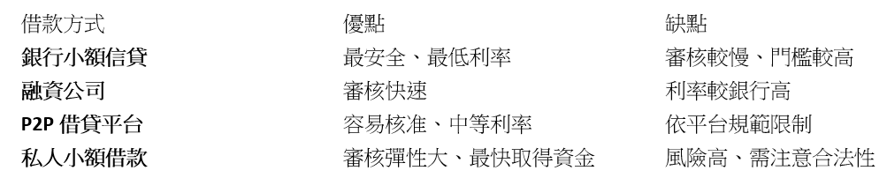 合法小額借款常見管道包含: